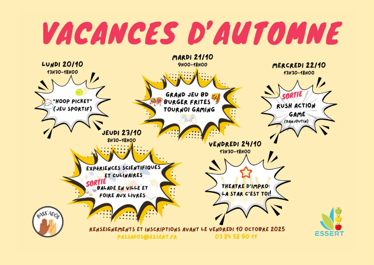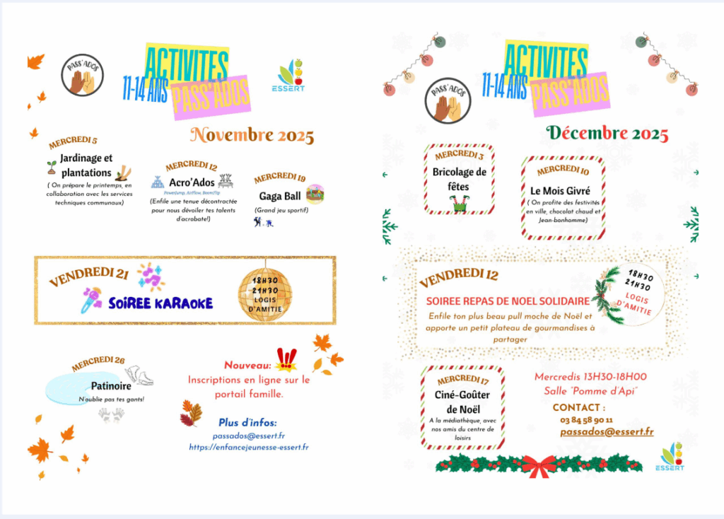 Le Pass’Ados vous donne rendez-vous tous les mercredis après-midi, de 13h30 à 18h00, pendant les vacances scolaires, et lors de soirées occasionnelles, au local Pomme d’Api (à côté de la mairie). Pour vous inscrire, retournez-nous le dossier administratif et la fiche sanitaire ci-dessous dûment remplis, ainsi qu’une copie des vaccinations à jour, une attestation d’assurance responsabilité civile et un RIB.