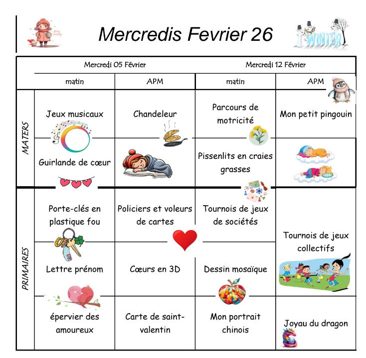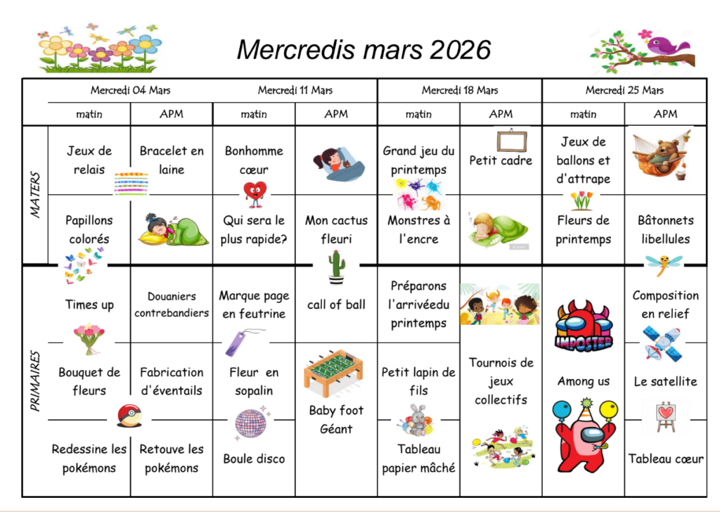 Le centre de loisirs est ouvert tous les mercredis en période scolaire, de 7h45 à 18h15.